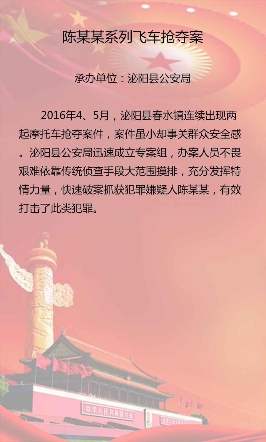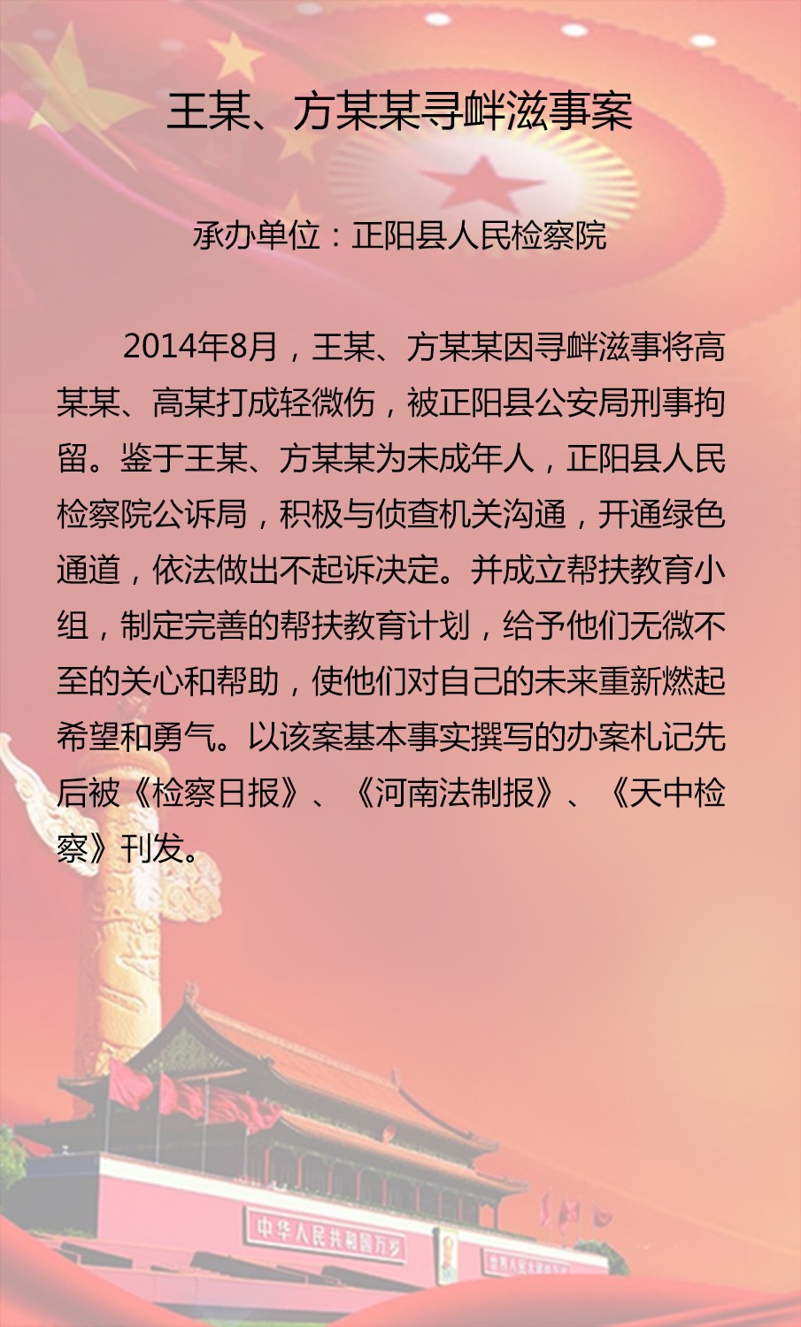 為展示我市政法機關在維護社會大局穩(wěn)定、促進社會公平正義、保障人民安居樂業(yè)中取得的突出成效,彰顯嚴格執(zhí)法、公正司法的價值理念,激發(fā)廣大政法干警爭辦精品案件、爭當辦案能手、爭創(chuàng)一流業(yè)績的創(chuàng)先爭優(yōu)意識,市委政法委在全市政法系統(tǒng)組織開展第三屆“十大精品案件”評選活動?,F(xiàn)將推薦上報篩選出的20起案件公示如下,歡迎大家參與投票評選。投票時間從即日起到12月20日截止。
