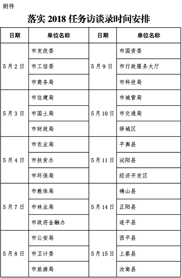 訪談對象為《駐馬店市人民政府關(guān)于印發(fā)<2018年市政府工作目標(biāo)責(zé)任考核獎懲辦法(試行)>的通知》(駐政〔2018]14號)中確定的12個縣區(qū)政府(管委會)、54個市直單位、駐駐單位和其他單位等考核對象。
