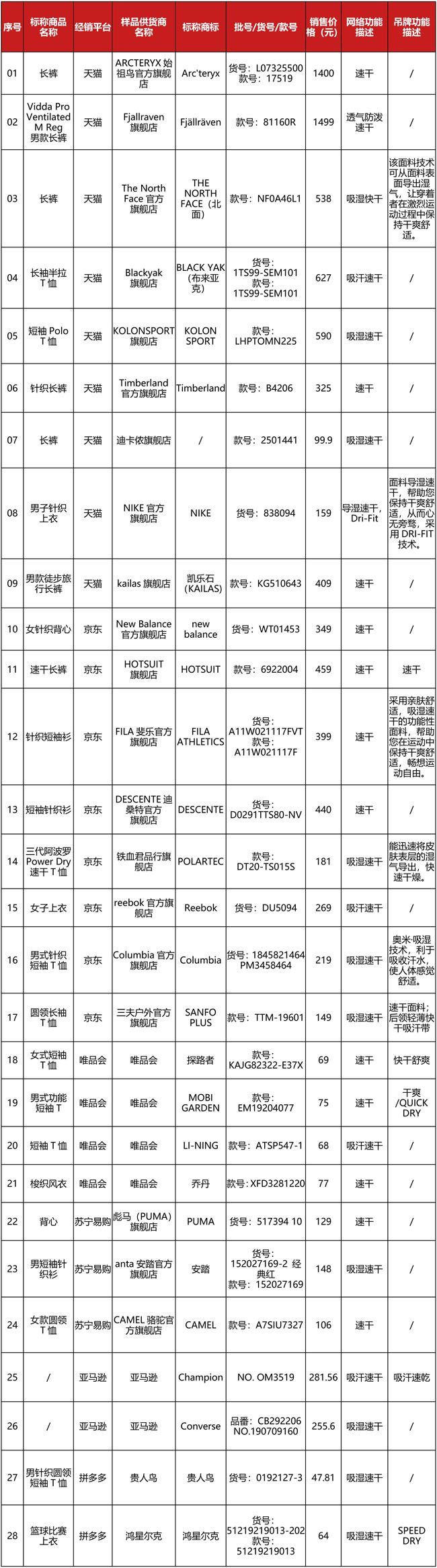 據(jù)介紹,本次比較試驗(yàn)樣品由北京市消費(fèi)者協(xié)會組織工作人員以普通消費(fèi)者身份從天貓、京東、唯品會、蘇寧易購、亞馬遜、拼多多等電商平臺購買,涉及40個品牌中銷量較高的40件吸濕速干衣樣品,購買價格從47.81元至1499元不等。