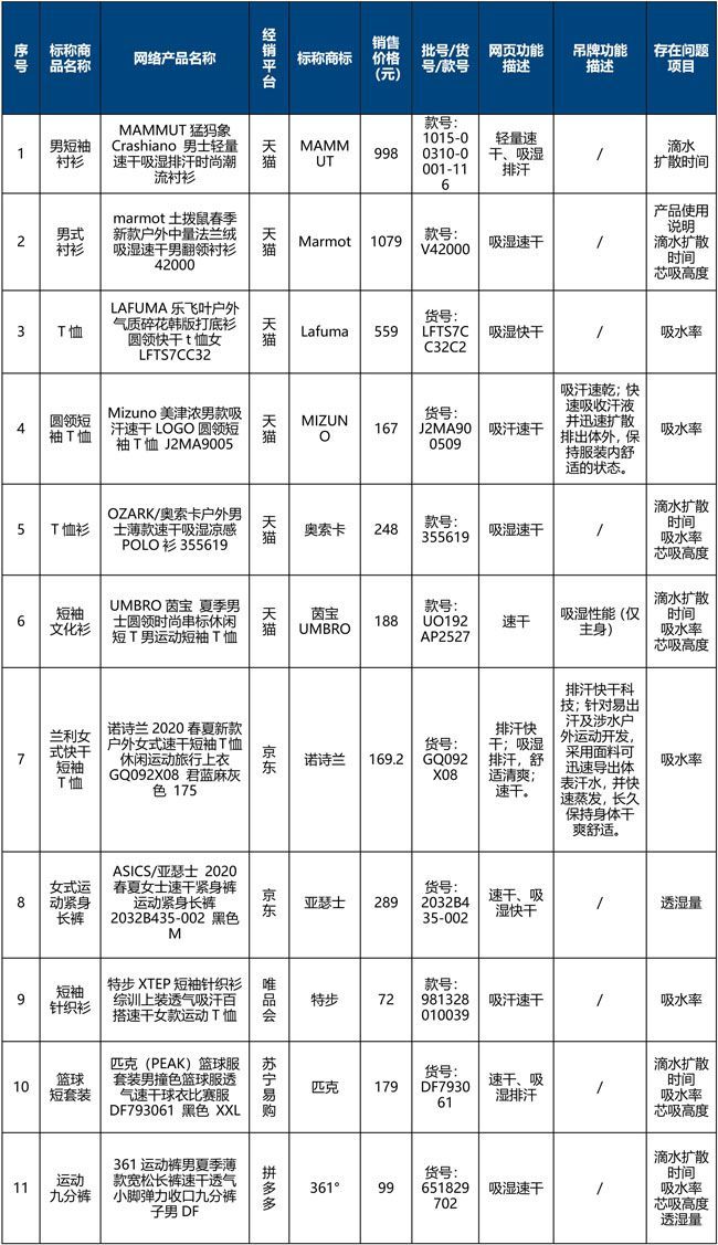 上述11件問題樣品包括,MAMMUT男短袖襯衫、Marmot男式襯衫、Lafuma(樂飛葉)T恤、MIZUNO(美津濃)圓領(lǐng)短袖T恤、奧索卡T恤衫、茵寶UMBRO短袖文化衫、諾詩蘭蘭利女式快干短袖T恤、亞瑟士女士運(yùn)動緊身長褲、特步短袖針織衫、匹克籃球短套裝、361°運(yùn)動九分褲。