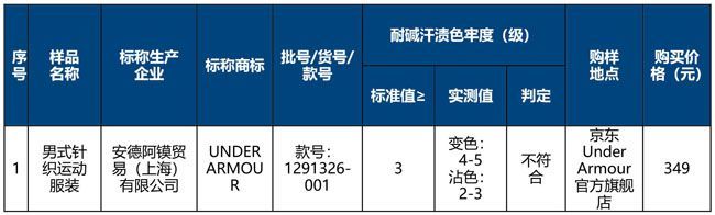 ——耐堿汗?jié)n色牢度。耐堿汗?jié)n色牢度是指紡織品在堿性汗液中的顏色保持程度。經(jīng)測試,40件樣品中,有1件樣品耐堿汗?jié)n色牢度項(xiàng)目不符合國家標(biāo)準(zhǔn)要求,為UNDER ARMOUR(安德瑪)的男式針織運(yùn)動服裝。