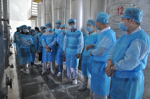 更換一次性消毒服裝、戴上消毒帽以及口罩、穿上無菌鞋套、大家“全副武裝”后跟隨河南省雙峰酒業(yè)有限公司董事長魯雙峰先后走進(jìn)了雙峰酒業(yè)的釀酒車間、發(fā)酵車間、以及灌裝車間等處。大家看到一個(gè)個(gè)先進(jìn)的工業(yè)化生產(chǎn)設(shè)備在廠區(qū)內(nèi)鱗次櫛比,據(jù)魯總介紹,2013年,他花巨資引進(jìn)了法國年加工5000噸野生葡萄酒生產(chǎn)線及工藝,將雙峰酒業(yè)公司打造成集野生山葡萄種植、葡萄莊園與度假村和野生山葡萄酒釀造、儲藏、銷售于一體的機(jī)構(gòu)。各位蒞臨現(xiàn)場的青年企業(yè)家們對魯總的膽識和氣魄都贊嘆不已,對“羋玥”野生山葡萄酒的歷史、酒的釀造過程、酒的功用有了深入的了解。