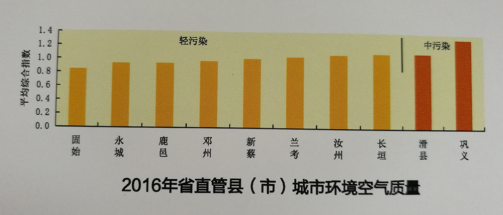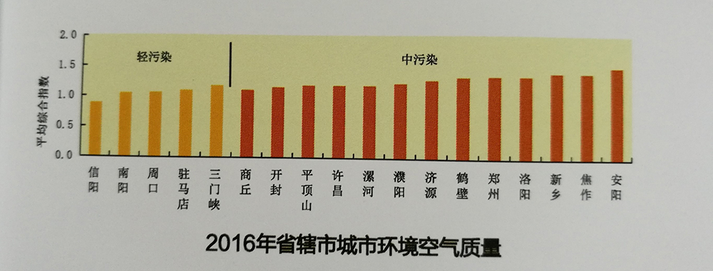 2016年,全省城市環(huán)境空氣質(zhì)量首要污染物為PM2.5,省轄市城市環(huán)境空氣質(zhì)量級(jí)別總體為中污染。其中,信陽(yáng)、南陽(yáng)、周口、駐馬店、三門峽5市環(huán)境空氣質(zhì)量級(jí)別為輕污染,其它13個(gè)市為中污染;省直管縣(市)城市環(huán)境空氣質(zhì)量級(jí)別為輕污染,其中,8個(gè)縣(市)為輕污染,鞏義、滑縣2個(gè)縣(市)為中污染。