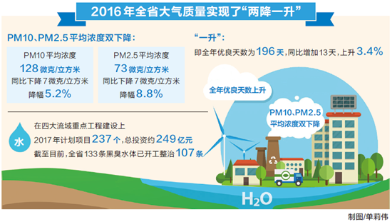 “兩降”,即PM10、PM2.5平均濃度雙下降,2016年全省PM10平均濃度128微克/立方米,同比下降7微克/立方米,降幅5.2%;PM2.5平均濃度73微克/立方米,同比下降7微克/立方米,降幅8.8%?!耙簧保慈陜?yōu)良天數(shù)為196天,同比增加13天,上升3.4%,超額完成國家下達(dá)我省指標(biāo)任務(wù)。