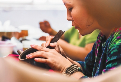 沁陽(yáng)黑陶,是我省非物質(zhì)文化遺產(chǎn)。如今,沁陽(yáng)市農(nóng)村青年湯麗在傳承黑陶古老的燒制技藝上,大膽創(chuàng)新,歷時(shí)3年,在國(guó)內(nèi)首家燒制出黑陶茶壺,具有藝術(shù)欣賞和收藏使用價(jià)值。她創(chuàng)辦的公司從事黑陶技藝的傳承、開(kāi)發(fā),生產(chǎn)出千種產(chǎn)品,多個(gè)產(chǎn)品在全國(guó)和省內(nèi)獲獎(jiǎng)。前不久,她被評(píng)為焦作市“黑陶非物質(zhì)文化遺產(chǎn)項(xiàng)目”代表性傳承人。(記者 王天定 攝影報(bào)道)