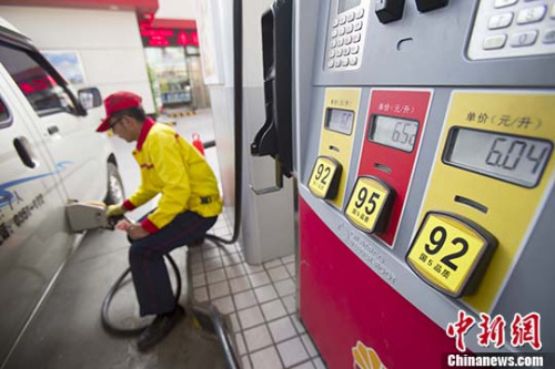 資料圖:山西太原,加油站工作人員給車輛加油。 中新社記者 張?jiān)茢z