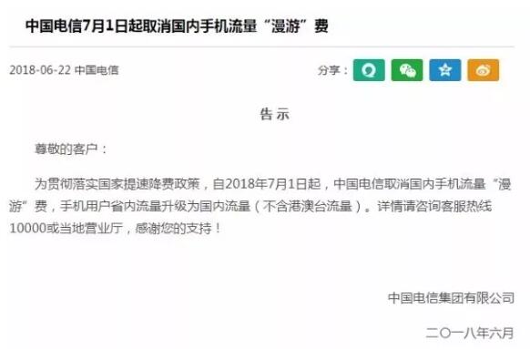 繼中國移動(dòng)、中國聯(lián)通之后,中國電信也宣布,自2018年7月1日起,取消國內(nèi)手機(jī)流量“漫游”費(fèi),手機(jī)用戶省內(nèi)流量升級為國內(nèi)流量(不含港澳臺(tái)流量)。至此,三大運(yùn)營商均確認(rèn)7月1日起取消流量“漫游”費(fèi)。