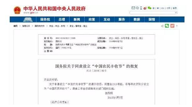 6月21日,國(guó)務(wù)院發(fā)布《關(guān)于同意設(shè)立“中國(guó)農(nóng)民豐收節(jié)”的批復(fù)》,同意自2018年起,將每年農(nóng)歷秋分設(shè)立為“中國(guó)農(nóng)民豐收節(jié)”。具體工作由農(nóng)業(yè)農(nóng)村部商有關(guān)部門(mén)組織實(shí)施。