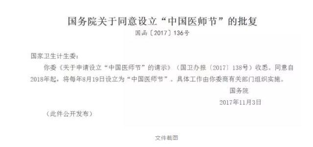 2017年11月20日,經(jīng)國(guó)務(wù)院批準(zhǔn),自2018年起,將每年8月19日設(shè)立為“中國(guó)醫(yī)師節(jié)”。