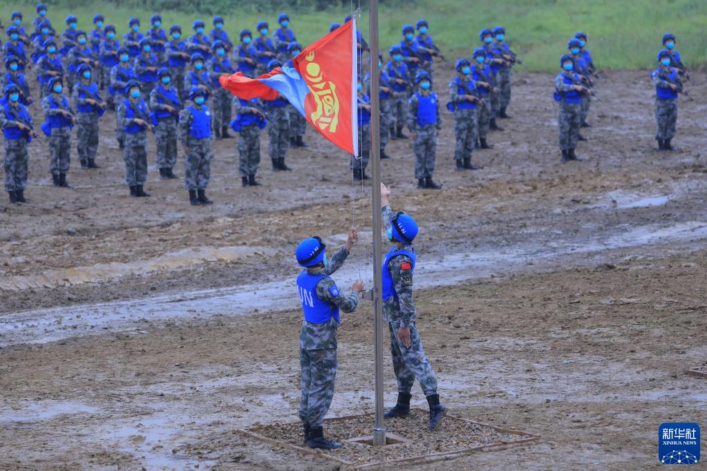 9月6日,在“共同命運-2021”國際維和實兵演習(xí)開始儀式上,升旗手升蒙古國國旗。新華社記者 劉芳 攝