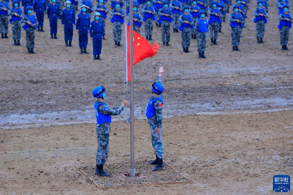9月6日,在“共同命運-2021”國際維和實兵演習(xí)開始儀式上,升旗手升中國國旗。新華社記者 劉芳 攝