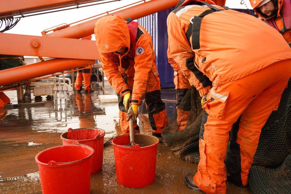 作業(yè)過程中,長(zhǎng)達(dá)十幾米的巨大拖網(wǎng)被起重設(shè)備吊起,投放至海底。當(dāng)拖網(wǎng)被撈出時(shí),海底地表淤泥(沉積物)積滿網(wǎng)底,科考隊(duì)員要在寒風(fēng)刺骨的甲板上,從成噸重的淤泥中慢慢“淘洗”出可能存在的生物樣本。