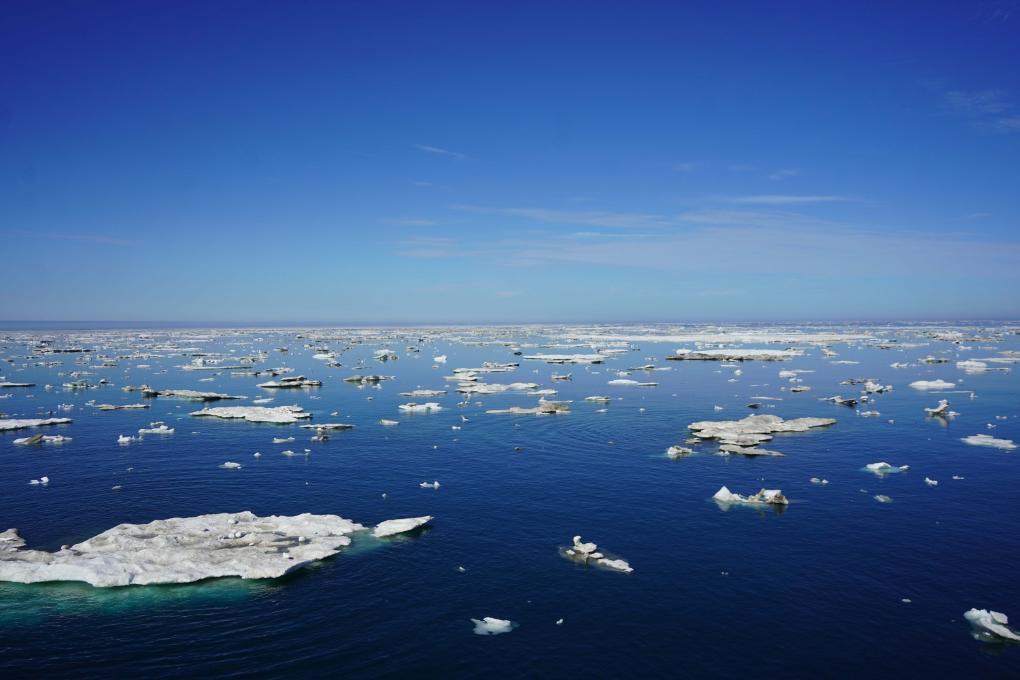 這是7月25日從“雪龍2”號(hào)極地科考破冰船拍攝的北極圈內(nèi)的浮冰。新華社記者魏弘毅攝