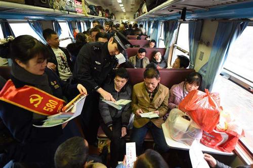 2017年2月8日,重慶客運段聯(lián)合重慶市總工會在重慶北開往廣州東的3805次列車上開設(shè)“法律講堂”和設(shè)立“律師咨詢點”,現(xiàn)場為外出打工的農(nóng)民工提供法律咨詢和政策宣傳 唐奕/攝