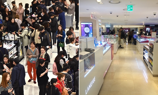 去年11月中旬(左)與今年3月9日(右)韓國首爾免稅店狀況對比。視覺中國供圖