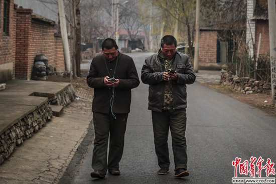 北京通州西集鎮(zhèn)尹家河村,工地因下雨停工。兩名來(lái)自內(nèi)蒙古赤峰的打工者用手機(jī)聽(tīng)廣播。