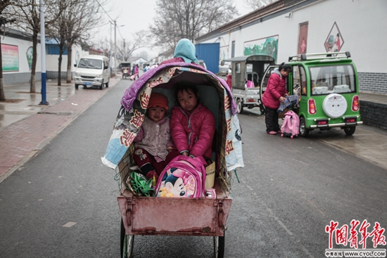 ????河北省香河縣王店子村二年級(jí)的王欣茹(右)和妹妹坐在奶奶的三輪車(chē)上放學(xué)回家。她們的父母都在香河縣城工作,平時(shí)由奶奶照看。