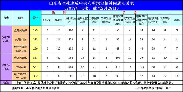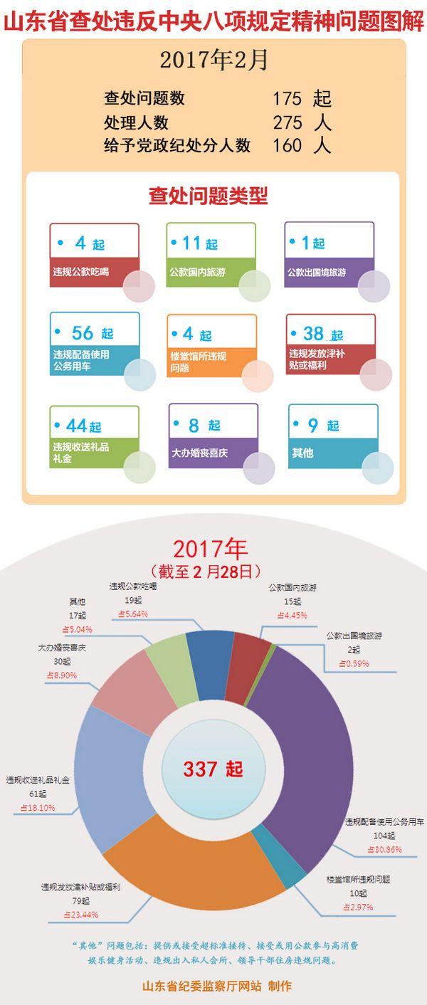 2017年2月,山東省各級(jí)紀(jì)檢監(jiān)察機(jī)關(guān)查處違反中央八項(xiàng)規(guī)定精神問題175起,處理275人,處分160人。