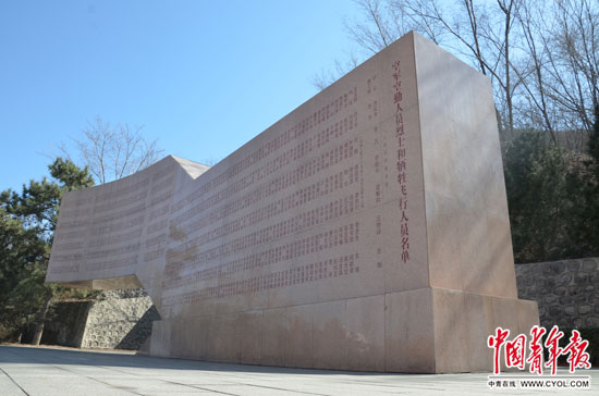 這面高約4.5米、長約16米的墻位于中國航空博物館南側(cè),前面是高大的“藍(lán)天魂”雕塑,后面是內(nèi)部被挖空、用作洞庫的大湯山。松柏掩映,莊嚴(yán)肅穆。