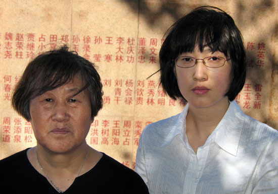 2010年,楊欣(右)和母親姜春梅在英烈墻前合影,墻上刻著父親楊會祿烈士的名字。資料圖片