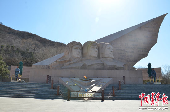 “藍(lán)天魂”雕塑前燃燒著一束長明火,后方一左一右矗立著英烈墻和英模墻。中國青年報(bào)·中青在線記者 王裴楠/攝
