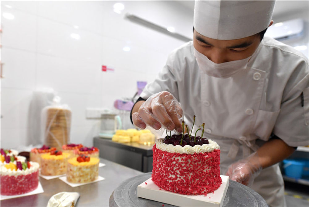 烘焙師在鄭州一家蛋糕店內(nèi)制作車?yán)遄拥案猓?2月6日攝)。新華社記者 李嘉南 攝
