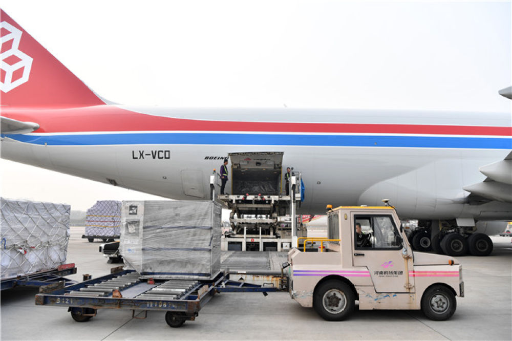 鄭州新鄭國際機(jī)場(chǎng)工作人員為盧森堡國際貨運(yùn)航空公司貨機(jī)卸貨(11月7日攝)。新華社記者 李嘉南 攝