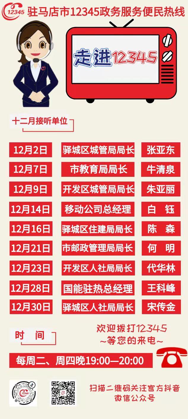 12月2日,記者從駐馬店市12345政務(wù)熱線服務(wù)中心獲悉,本月,驛城區(qū)城管局、市教育局、開發(fā)區(qū)城管、移動(dòng)公司、驛城區(qū)住建局、市郵政管理局、開發(fā)區(qū)人社局、國(guó)能駐熱、驛城區(qū)人社局9家單位主要負(fù)責(zé)同志現(xiàn)場(chǎng)接聽12345熱線。