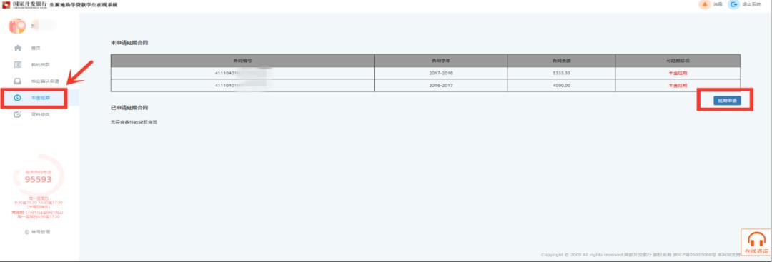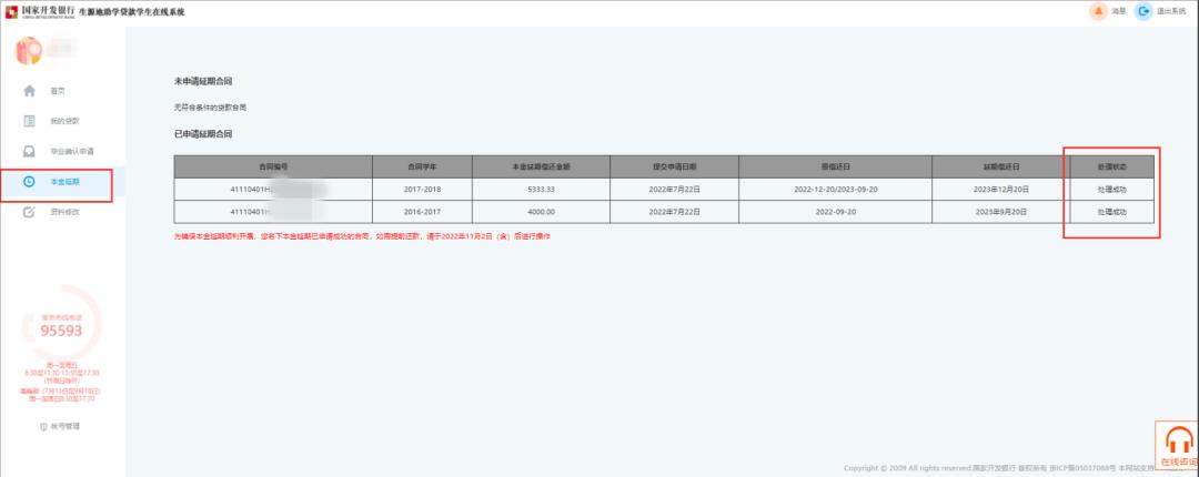 已申請“本金延期償還”的學(xué)生,不得撤銷延期申請,但在延期內(nèi)可以申請?zhí)崆斑€款。如借款學(xué)生名下有多筆助學(xué)貸款合同,需在不晚于最早到期合同申請截止日前,通過學(xué)生在線系統(tǒng)一并申請,超過申請截止時(shí)間的貸款合同將無法申請。