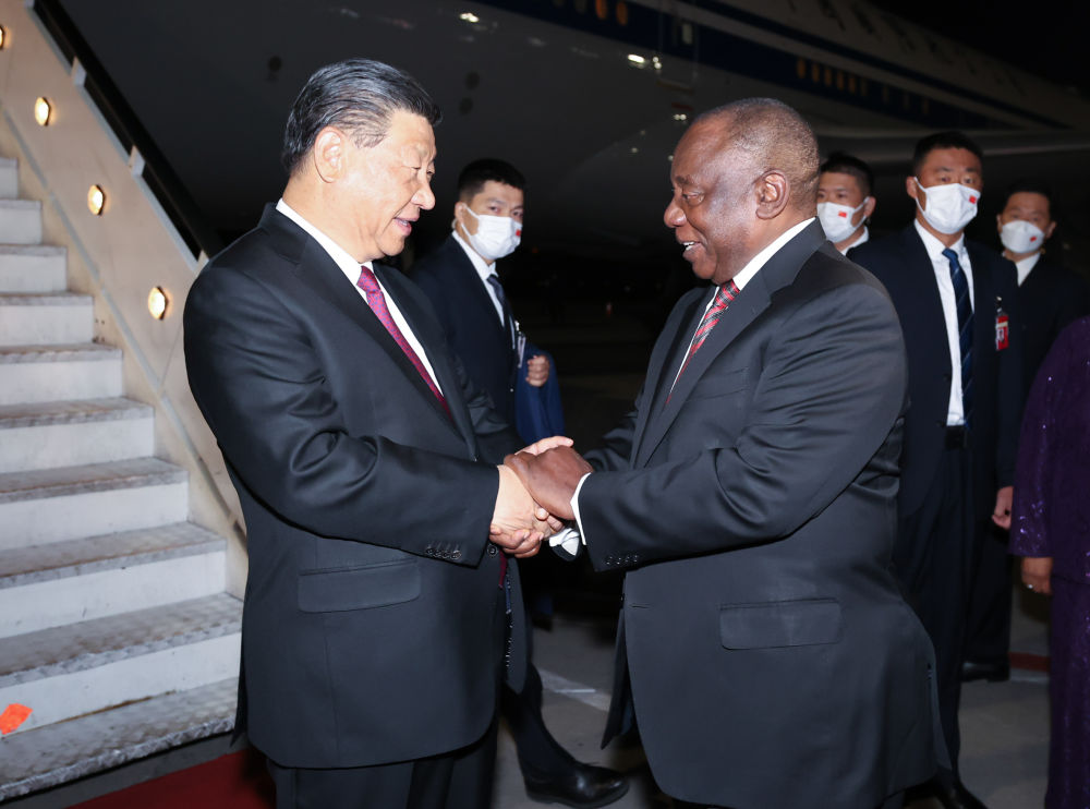 這是習(xí)近平在機(jī)場(chǎng)受到南非總統(tǒng)拉馬福薩等熱情迎接。新華社記者 李學(xué)仁 攝