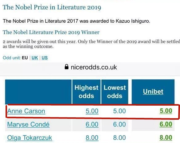 不出所料,這回諾獎(jiǎng)周,又是博彩公司大出風(fēng)頭,雖然好像每年都沒(méi)猜準(zhǔn)。今年以一賠五高居獲獎(jiǎng)賠率第一的,是加拿大女詩(shī)人安妮·卡森。