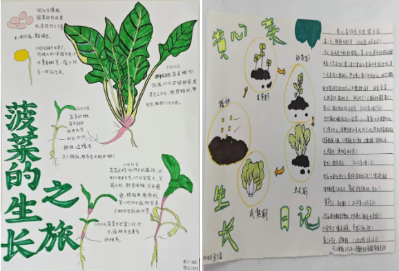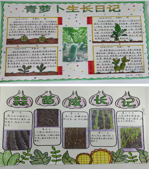 同學(xué)們將自己的種植計(jì)劃與觀察到的蔬菜生長(zhǎng)過程,用畫筆精心繪制成“蔬菜小報(bào)”。一張張精美的小報(bào),展現(xiàn)了孩子們?cè)诜N植中的用心與觀察的細(xì)致。