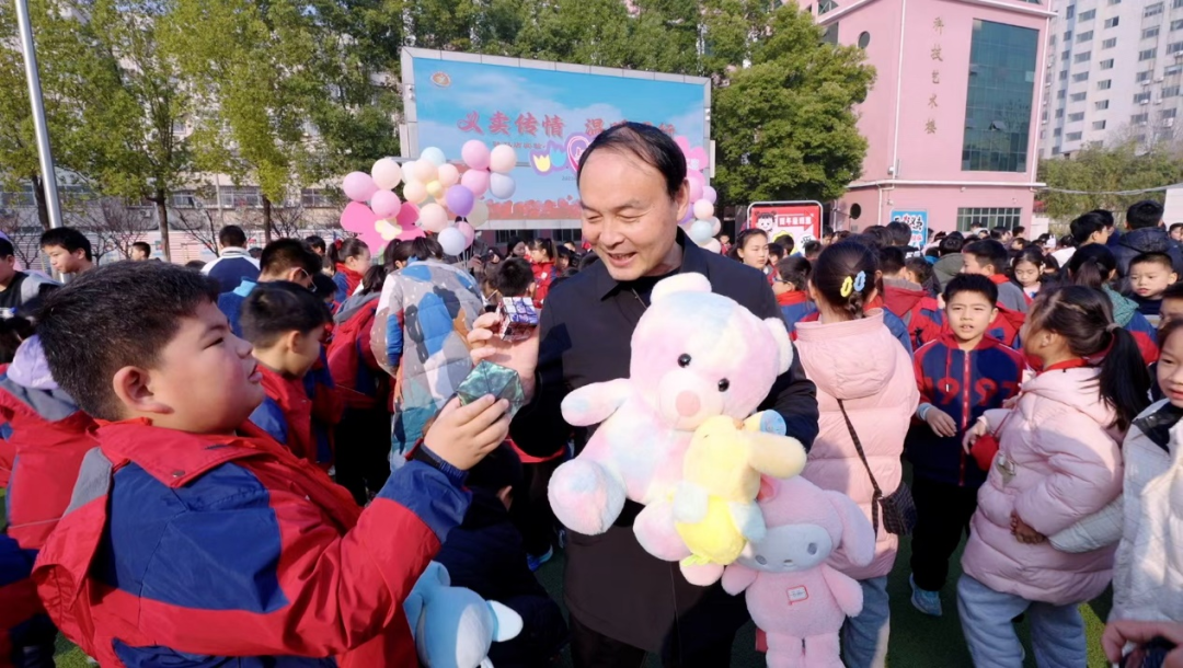 活動現(xiàn)場猶如熱鬧的小集市,迷你商鋪的攤位上商品琳瑯滿目,攤位前人頭攢動。學生們紛紛化身小小攤主、“帶貨”達人、理貨能手,各顯其能。“小小售賣員”的吆喝聲此起彼伏:“快來買呦,我們這里的物品又多又好!”“謝謝你獻出的一份愛心!”“好玩的毛絨玩具,2塊錢一個,不要錯過啦!”他們用稚嫩的話語為愛心公益盡心盡力,臉上洋溢著幸福的笑容。