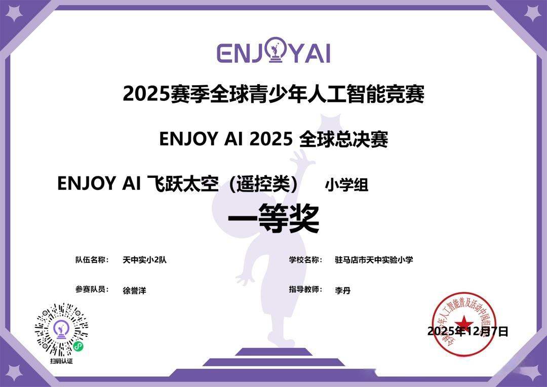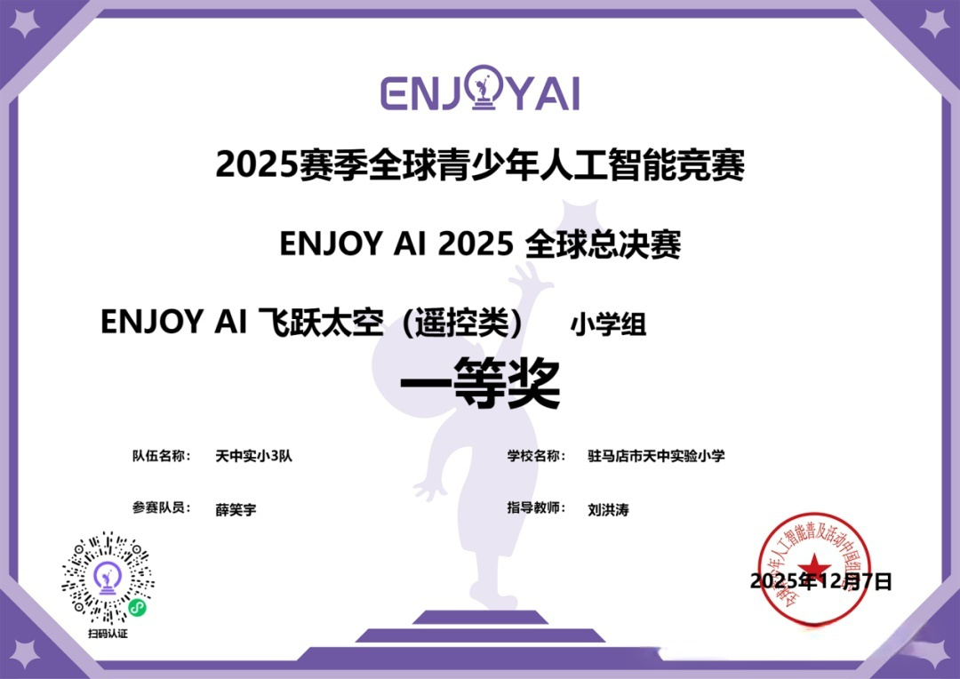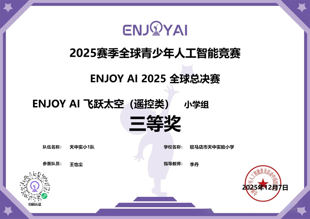 近日,ENJOY AI 2025全球總決賽暨第三屆烏鎮(zhèn)國際教育機(jī)器人節(jié)在浙江烏鎮(zhèn)圓滿落幕。駐馬店經(jīng)濟(jì)開發(fā)區(qū)天中實(shí)驗(yàn)小學(xué)學(xué)子在全球61個國家和地區(qū)6萬余名選手的激烈角逐中脫穎而出,徐譽(yù)洋、薛笑宇同學(xué)勇奪“飛躍太空(遙控類)”小學(xué)組一等獎,王也塵同學(xué)斬獲三等獎。