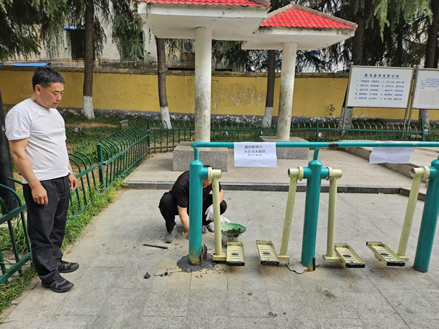 本次基礎(chǔ)設(shè)施維修維護(hù)工作圍繞“安全、節(jié)約、可持續(xù)”原則,堅(jiān)持“便民、利民、惠民”的服務(wù)宗旨,及時修復(fù)排查時發(fā)現(xiàn)的破損、傾斜護(hù)欄,同時,組織相關(guān)技術(shù)人員對因使用率高造成松動的健身器材進(jìn)行加固處理,延長基礎(chǔ)設(shè)施使用壽命。