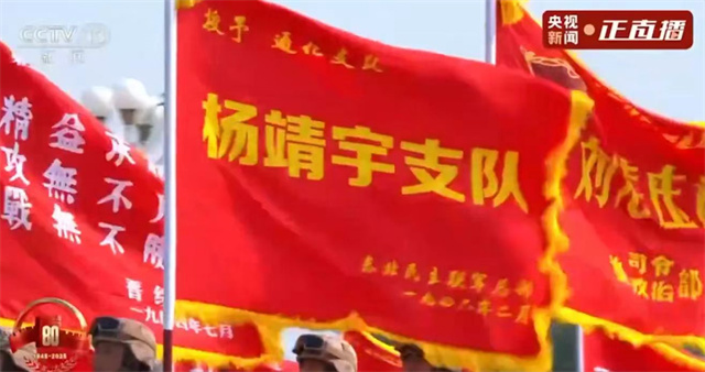 2025年9月3日,在紀(jì)念中國(guó)人民抗日戰(zhàn)爭(zhēng)暨世界反法西斯戰(zhàn)爭(zhēng)勝利80周年大會(huì)閱兵儀式中,“楊靖宇支隊(duì)”的戰(zhàn)旗迎風(fēng)飄揚(yáng),接受黨和人民的檢閱。近20秒的特寫(xiě)畫(huà)面,令無(wú)數(shù)中華兒女心潮澎湃。在楊靖宇將軍的家鄉(xiāng)駐馬店,人們紛紛鼓掌歡呼,表達(dá)對(duì)英雄的崇敬與對(duì)家鄉(xiāng)的熱愛(ài)。