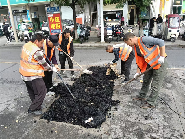 施工期間,工作人員錯時錯峰作業(yè),運用小型切縫機、電鎬、平板夯等設(shè)備,用瀝青冷補料應(yīng)急維修路面“小坑微塘”,保障道路完好平整,守護群眾“腳下安全”。截止目前,已維修破損瀝青路面11處。