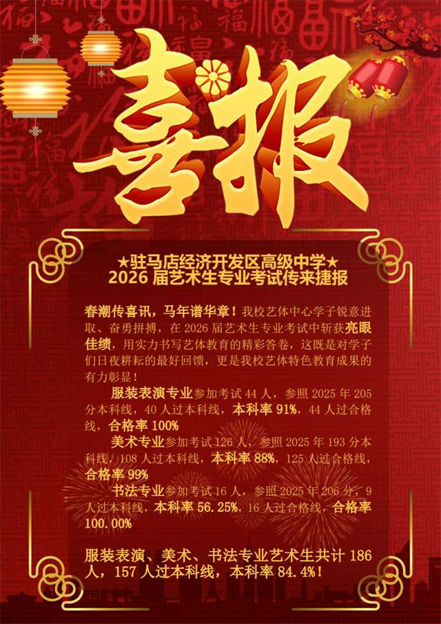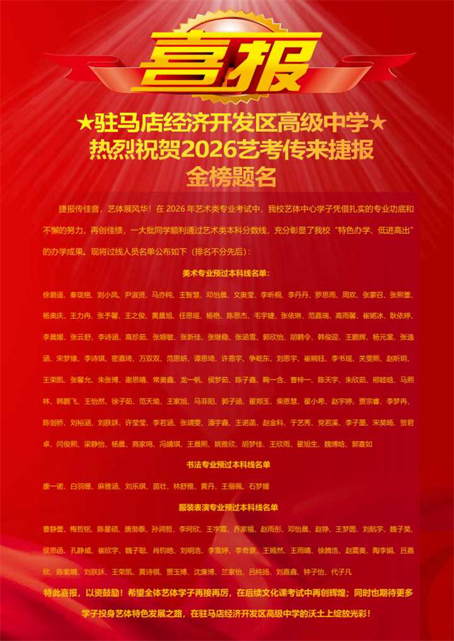 在此,向所有取得優(yōu)異成績的2026屆藝術(shù)生致以最熱烈的祝賀!向辛勤付出的專業(yè)教師團隊、默默支持的家長及社會各界表示最誠摯的感謝!未來,駐馬店經(jīng)濟開發(fā)區(qū)高級中學(xué)將繼續(xù)秉持藝體教育初心,深耕特色育人之路,為學(xué)子們搭建更廣闊的成長舞臺,助力更多藝術(shù)追夢人奔赴理想前程,再創(chuàng)教育新輝煌!