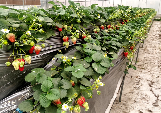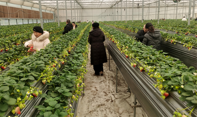 目前,草莓進入盛果期,畝產(chǎn)量可達5000斤,采摘期將持續(xù)至五月份。