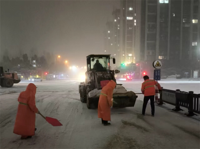 作業(yè)中,除雪隊伍聚焦城市主干道、涵洞橋梁等交通關(guān)鍵節(jié)點,優(yōu)先保障通行命脈暢通,通過機械連續(xù)作業(yè)、融雪劑精準撒布,快速破除路面冰雪障礙;針對行政辦公區(qū)域、學校周邊、醫(yī)院周邊、公交站點、交通樞紐等人流密集區(qū)域,采取“機械清掃+人工精細化清理”模式,逐一掃清人行道、路口轉(zhuǎn)角等機械作業(yè)盲區(qū),確保不留死角、不留隱患。在示范區(qū)的統(tǒng)籌協(xié)調(diào)下,政企協(xié)同發(fā)力,作業(yè)人員頂風冒雪、晝夜奮戰(zhàn),以高效行動筑牢城市安全防線。