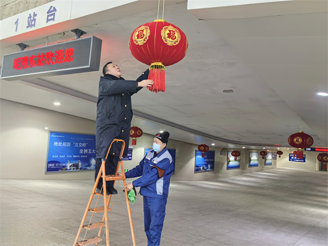 紅燈高掛映初心,福暖歸途擔(dān)使命。新春臨近,駐馬店車務(wù)段明港東站年味漸濃,黨員干部率先垂范、帶頭沖鋒,職工群眾踴躍響應(yīng),一場全員同心的“車站煥新提質(zhì)”行動(dòng)溫情上演。大家分工協(xié)作,有的登高校準(zhǔn)懸掛紅燈籠,確保橫平豎直;有的登高張貼福字,讓朱紅福韻鋪滿角落,共同為車站“穿”上新春盛裝。